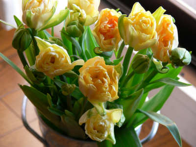 八重咲きのチューリップです。チョッと濃い目の黄色にグリーンのラインもうっすら見える。